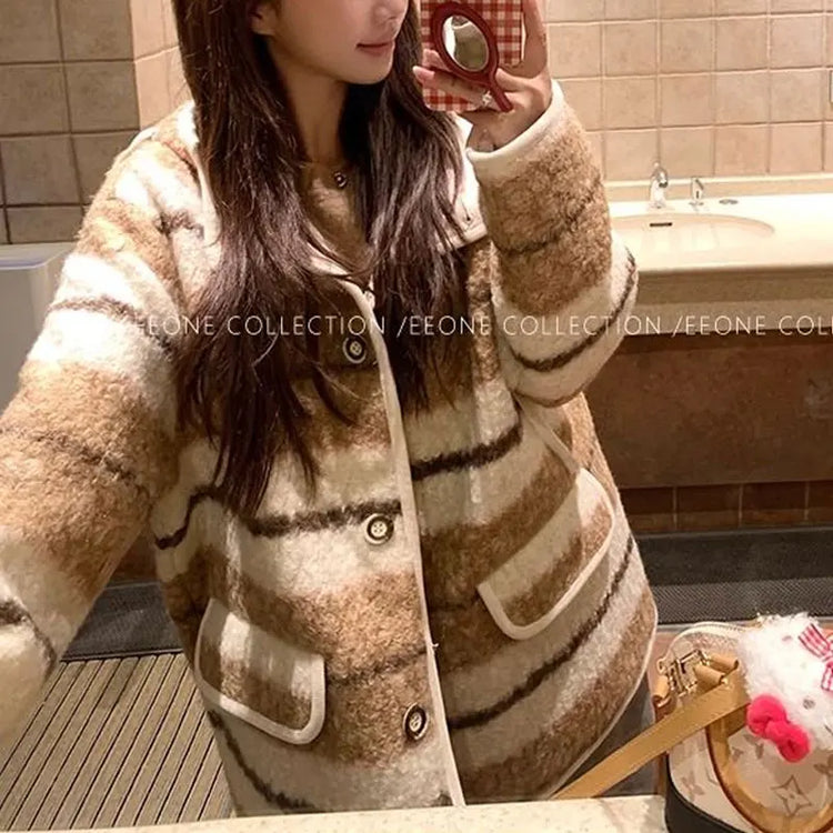 Casual Vintage Hooded Striped Wool Coats Autumn Winter New Loose Pockets Spliced Female Clothing Stylish Single-breasted Blends