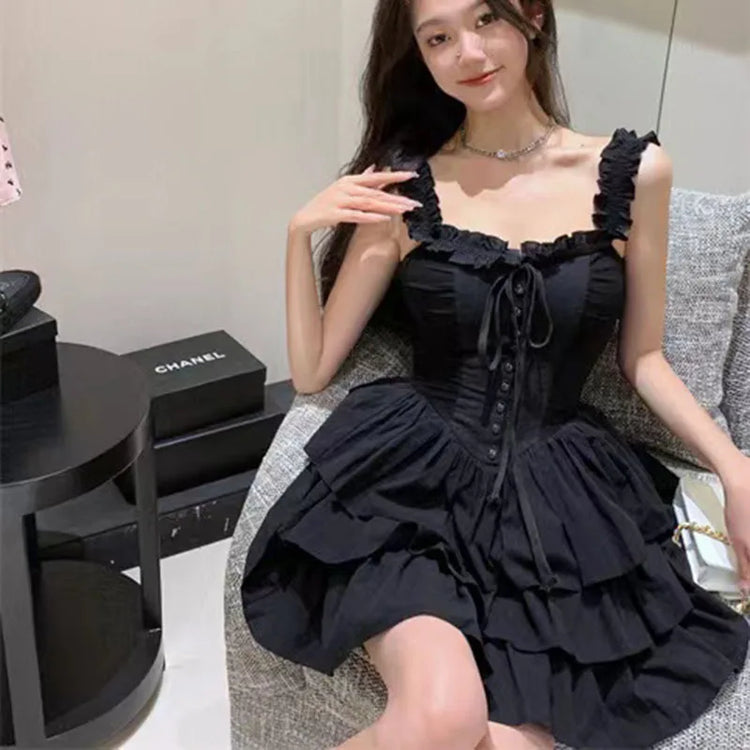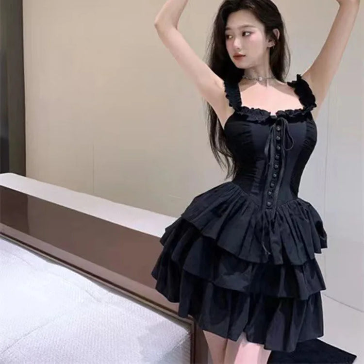 Gothic Black Sexy Slip Dress Y2K Harajuku Streetwear Punk Lace Up Cake Dress Female Summer Korean Fashion Party Ruffles Dresses