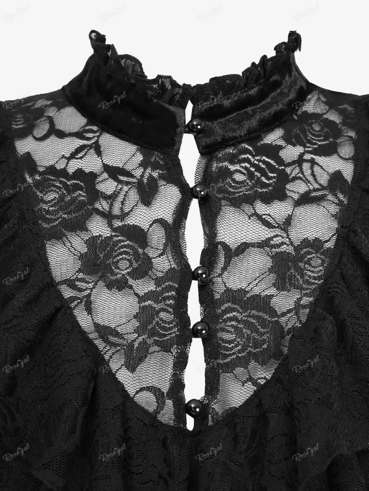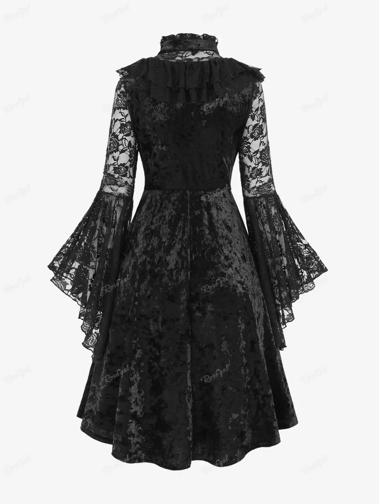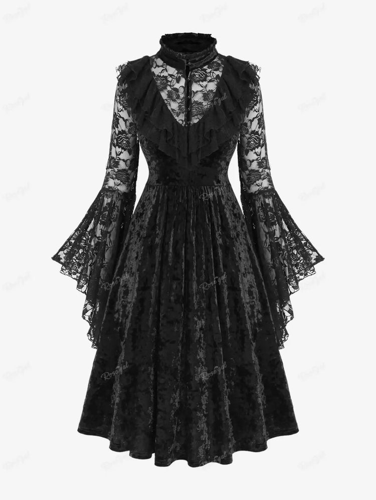 ROSEGAL Plus Size Gothic Lace Floral Panel Flare Sleeves Ruffles Velvet Buttons Dress 2025 Lace Long Sleeve Dress