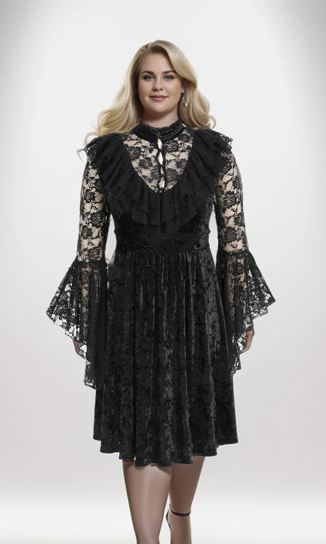 Model Number: Plus Size Gothic Floral Lace Panel Flare Sleeves Dress