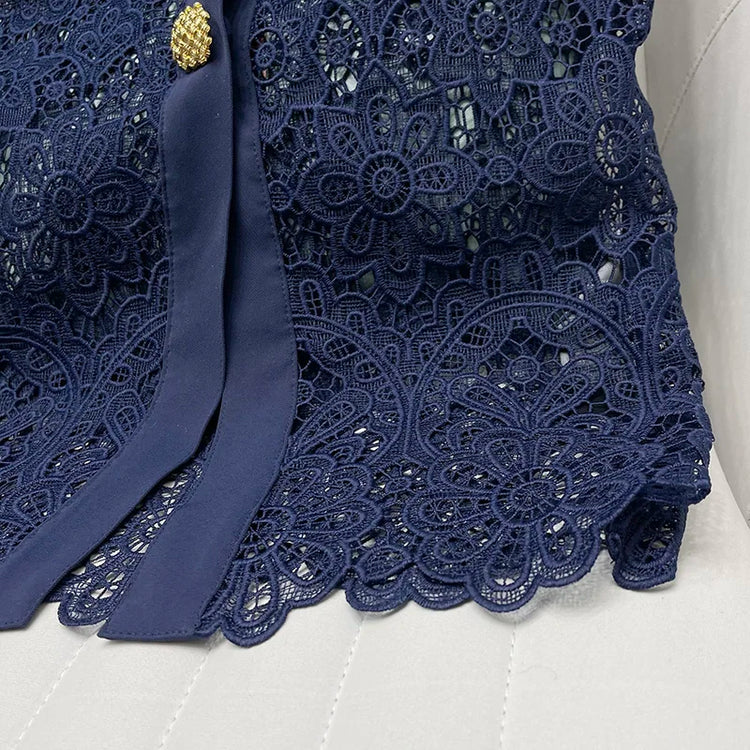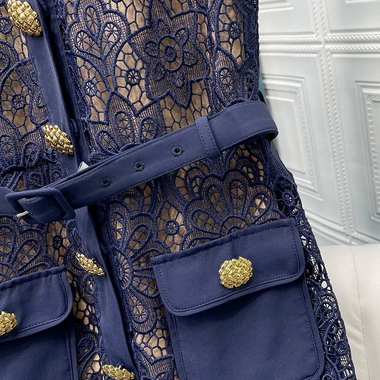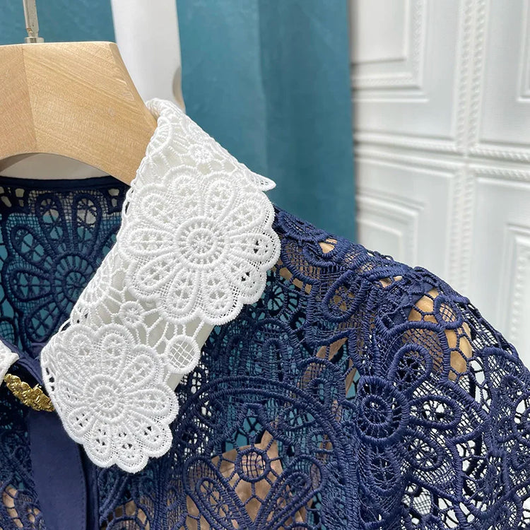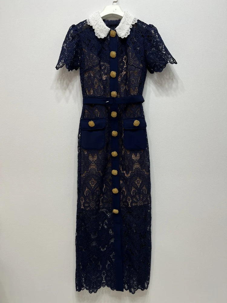 Water soluble lace Navy Blue peter pan collar pocket buttons decoration women dress high waist slim temperament Pencil Dress