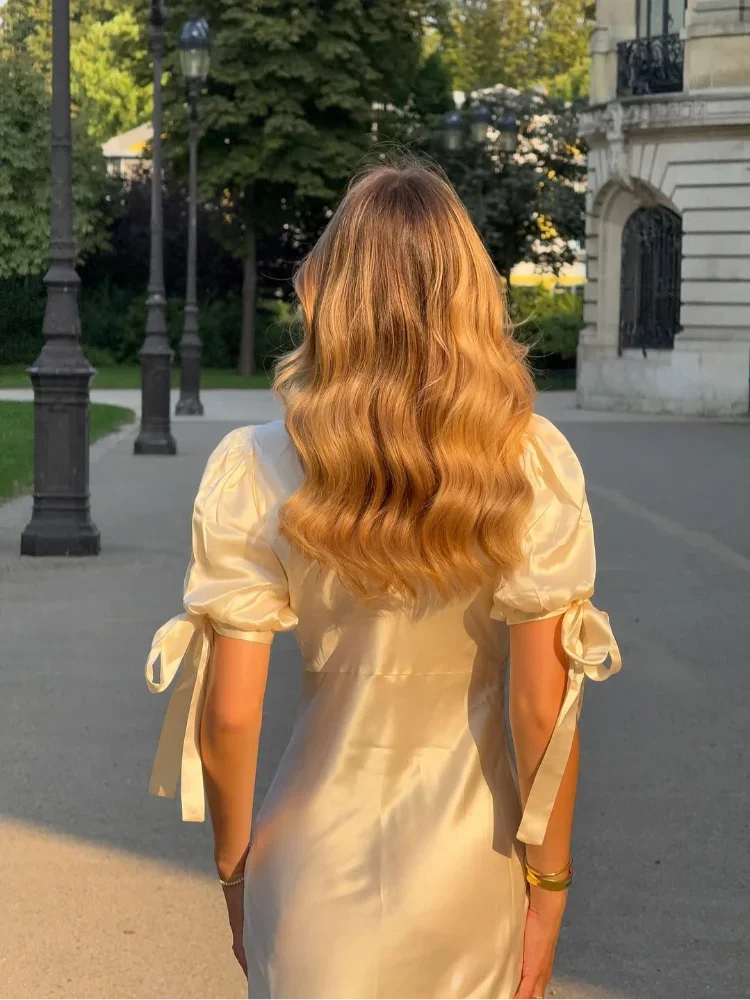 Women Lace Patchwork Satin Maxi Dress Elegant Bow U-neck Short Sleeve High Waist Slim Dresses 2025 New Summer Lady Commute Robes