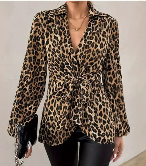 Fashion Women New Leopard Print Lace-up Shirt Top Spring Casual V-neck Long Sleeved Blouses Tops Office Lady Party Top 2025