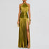 Gold Sexy Halter High Split Gowns Evening Dress Woman Chic Solid Hollow Pleated Long Dress Spring Summer Backless Zip Maxi Dress