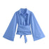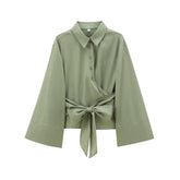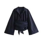BWQ Autumn and Winter New Women's Fashion Casual Polo Neck Bow Tie up Short Edition Double breasted Poplin Shirt