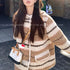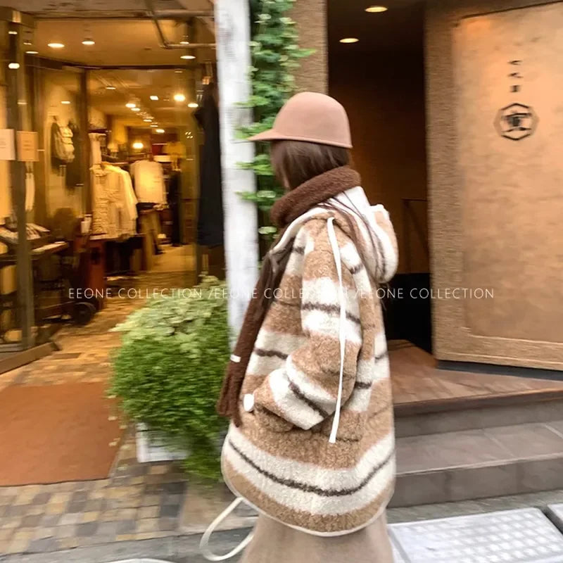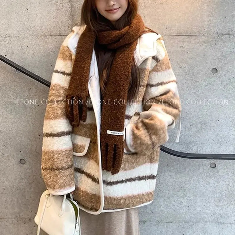 Casual Vintage Hooded Striped Wool Coats Autumn Winter New Loose Pockets Spliced Female Clothing Stylish Single-breasted Blends