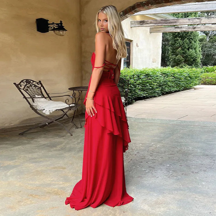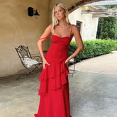 Cryptographic Elegant Ruffled Detail Slip Maxi Dress Vacation Outfits Sexy Backless Banadage Red Dresses Summer Sun Dresses New