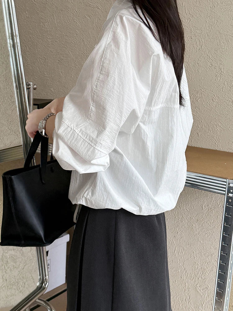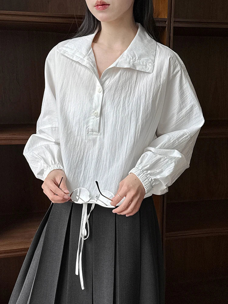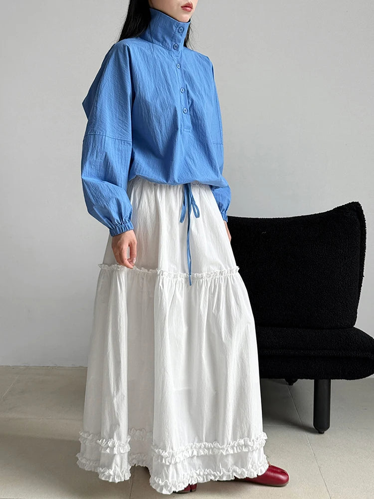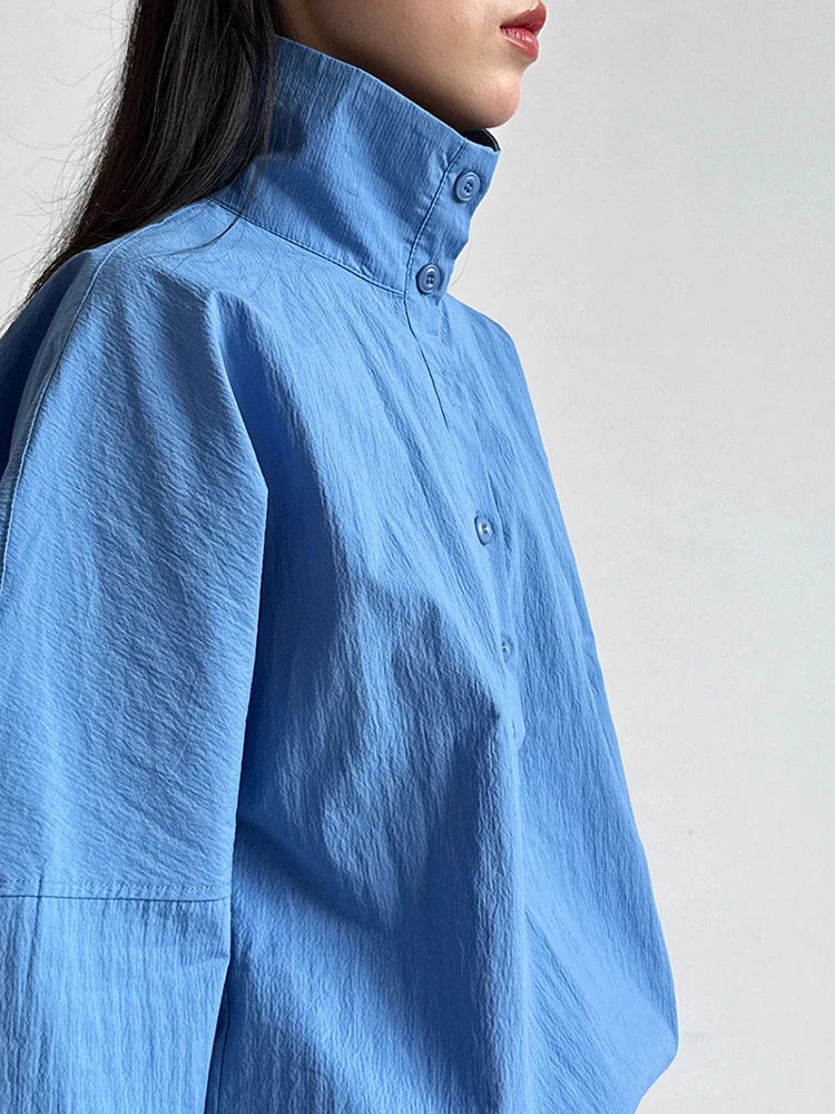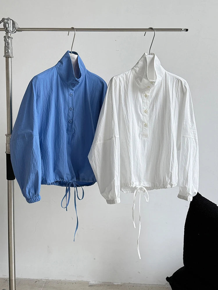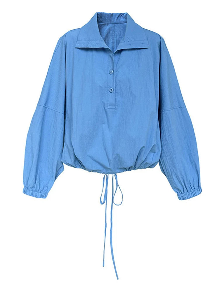 [EAM] Women Blue Drawstring Big Size Casual Blouse New Stand Collar Long Sleeve Shirt Fashion Tide Spring Autumn 2025 1DJ0930