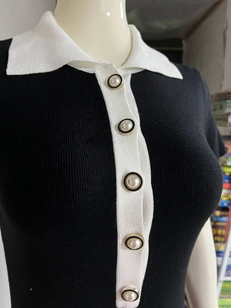Elegant Knit Maxi Dress for Women Short Sleeve Patchwork Party Dresses Fashion Lapel Single-breasted Slim Knitwear Women's Dress