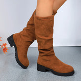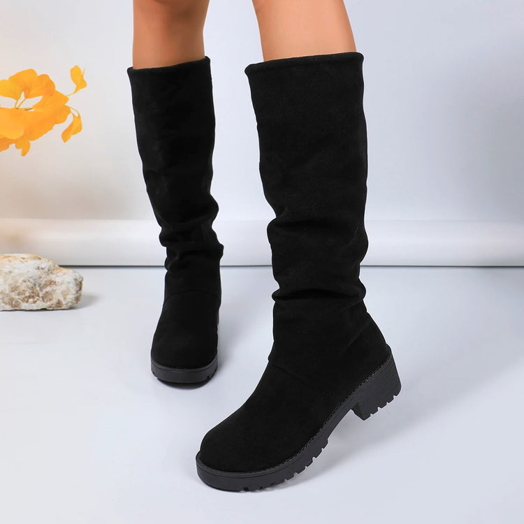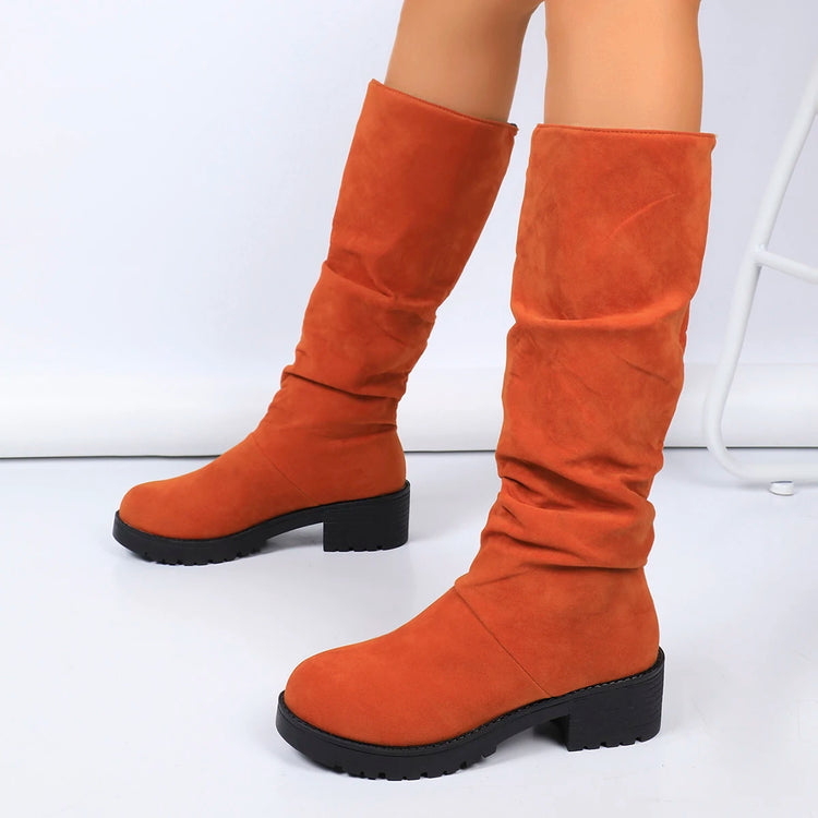 Fashion Boots for Women Suede Thick Middle Heel Folded Stacked Mid-calf Boots Round Toe Slip-On Sexy Elegant Women's Boots