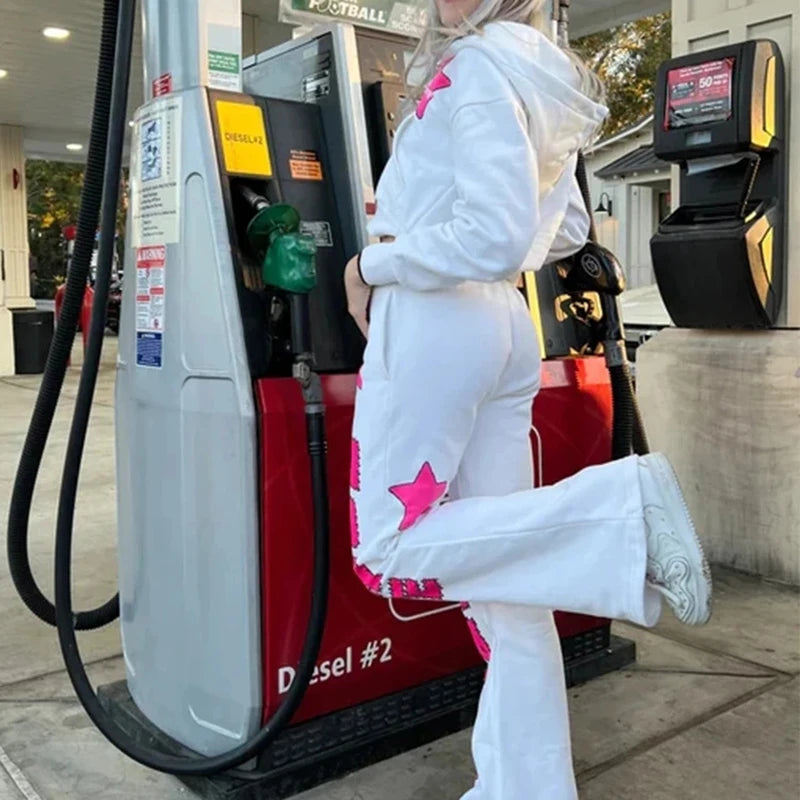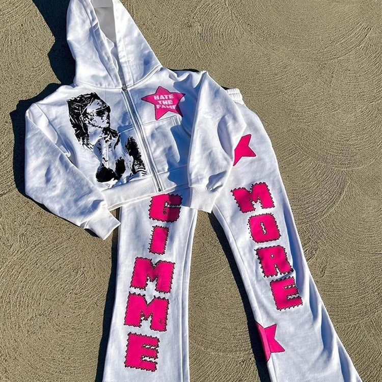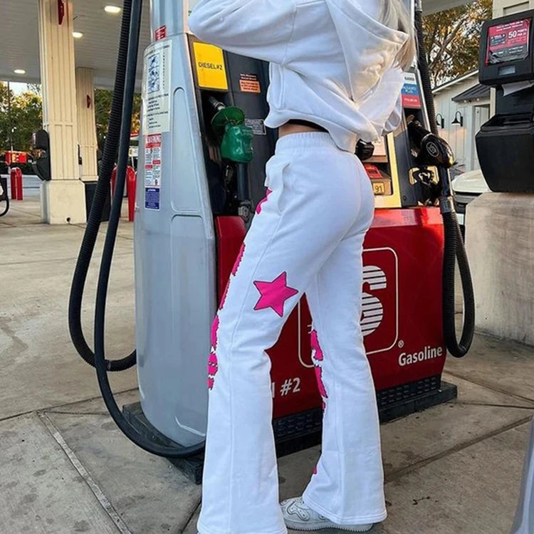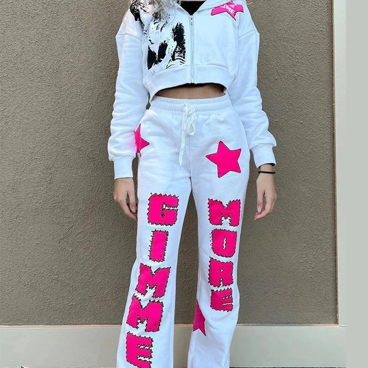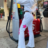 High Street Casual Sports Jacket Women Y2K Star Patchwork Aesthetic Varsity Jacket + Straight Pants White Letter Fashion Suit