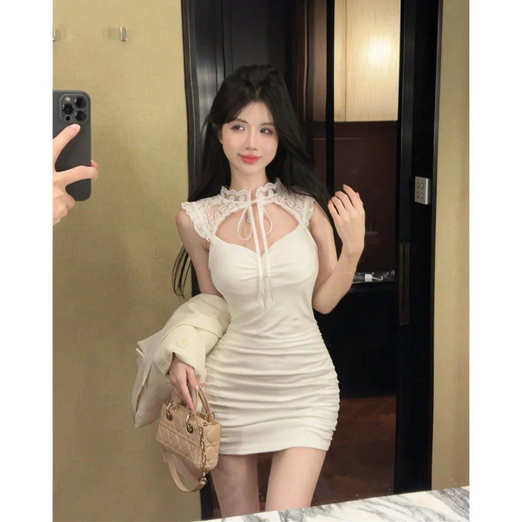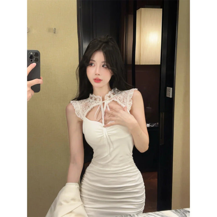Skirt Women's Splicing Pure Hot Girl Sexy Lace Splicing Tie Small Sleeveless Tight Hip-pack Dress