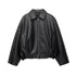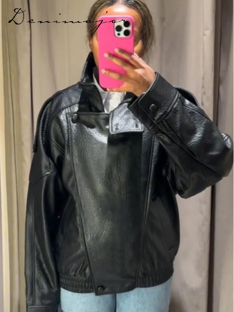 Street Women's Black Leather Jackets Loose Stand Collar Zipper Button Full Sleeve Coats 2025 Autumn Lady Chic Locomotive Outwear