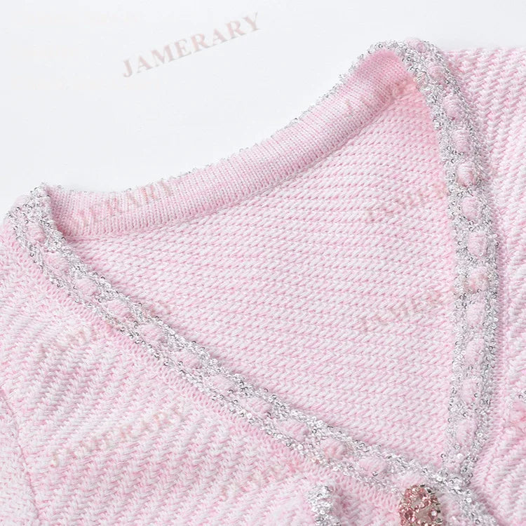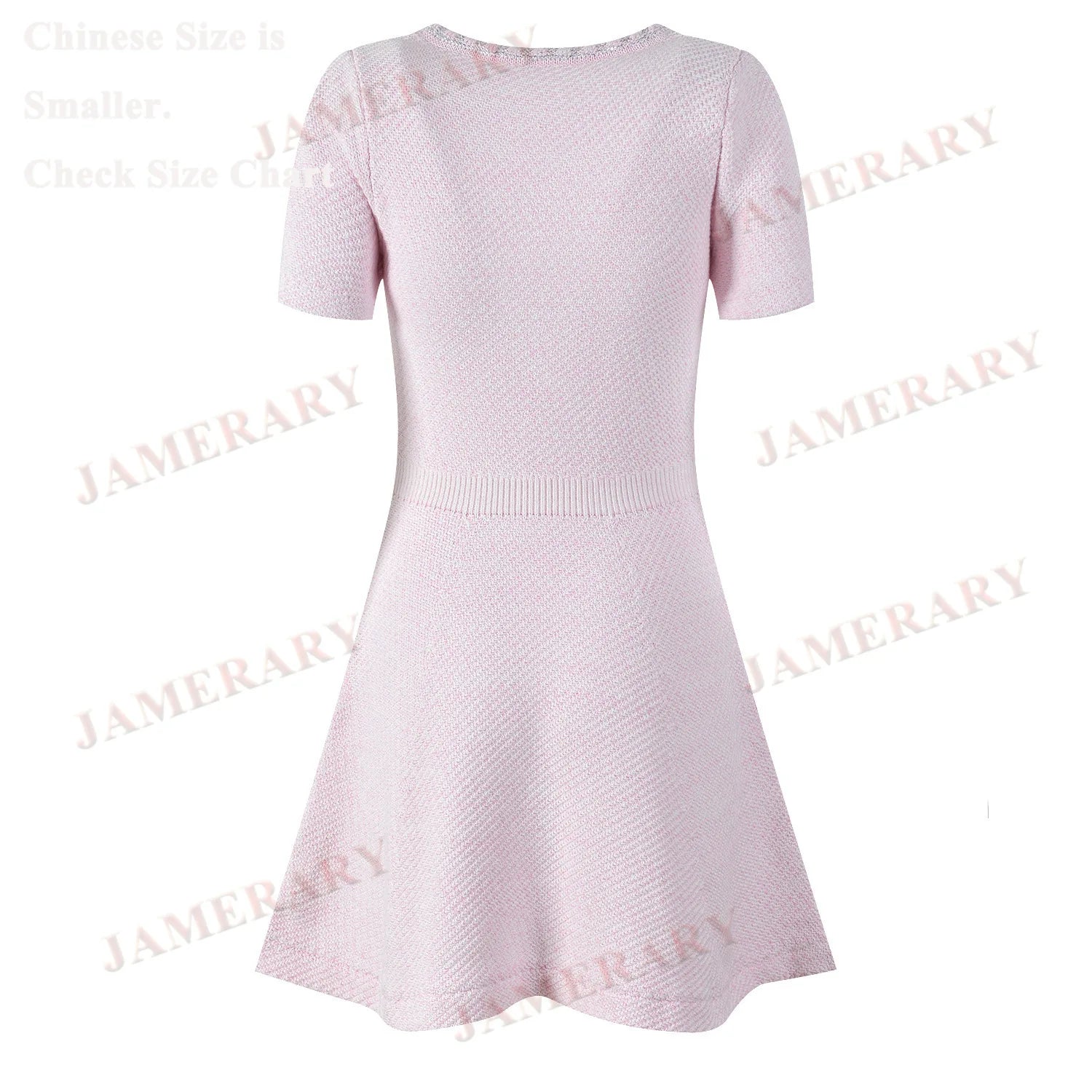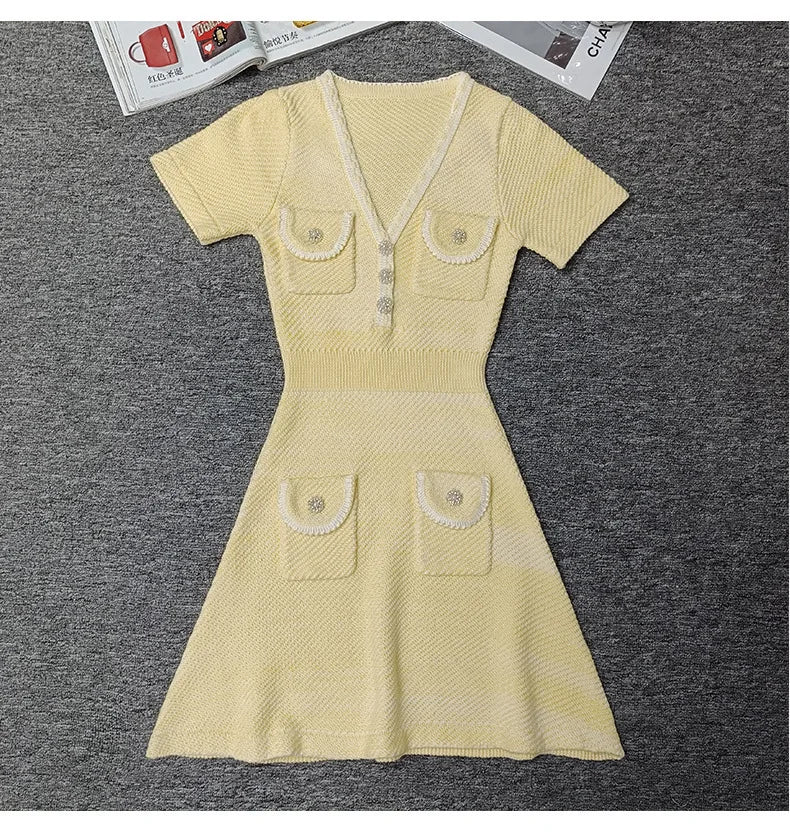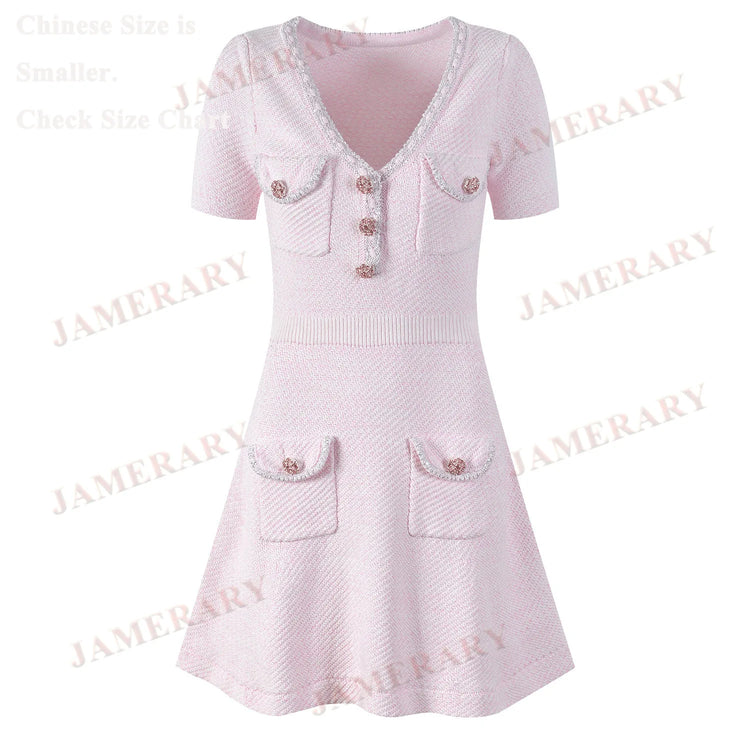 Summer Autumn Single Breasted Pearl Crystal Short Sleeve Knitted Sweater Dresses Women Sweet Knitwear Mini Knitting Dress