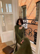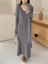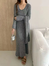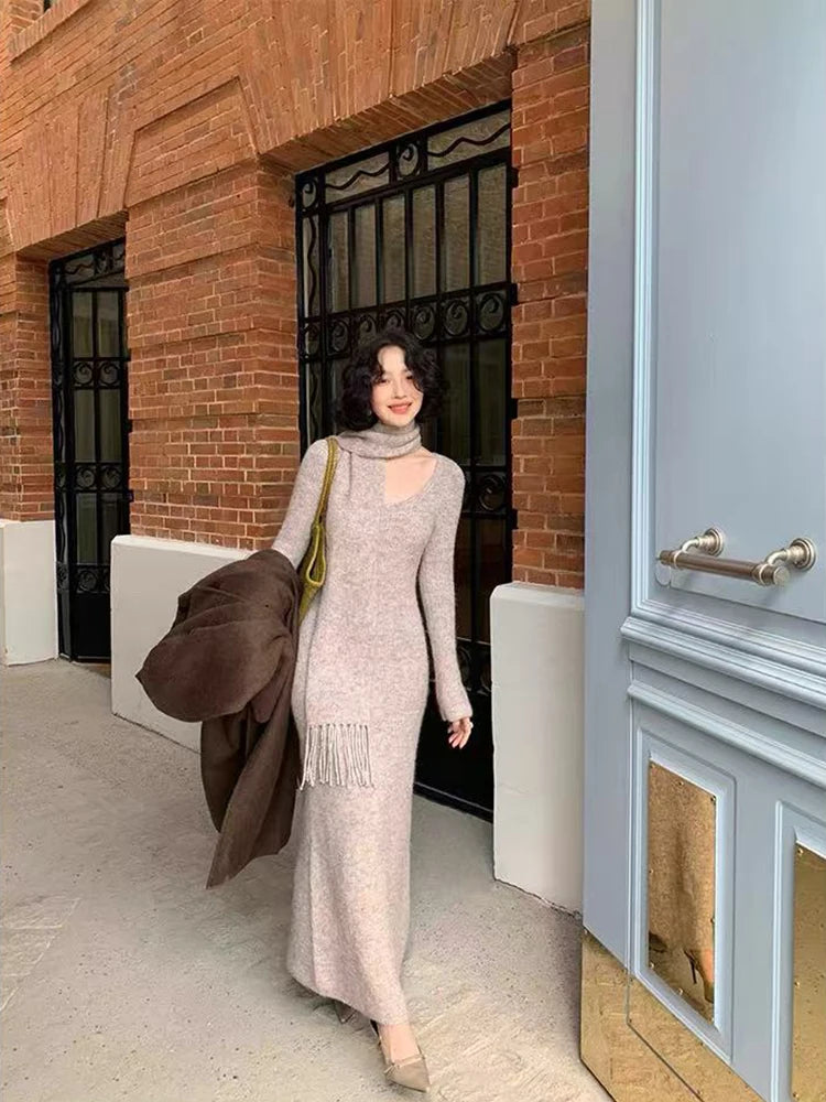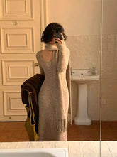 Vintage Knitted Midi Dress Y2K Autumn Slim with Scarf Long Sleeve Dress Female Korean Streetwear Chic All Match Female Vestidos