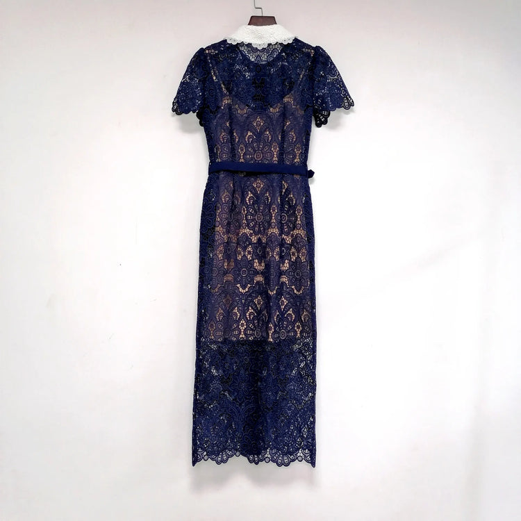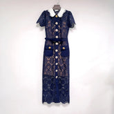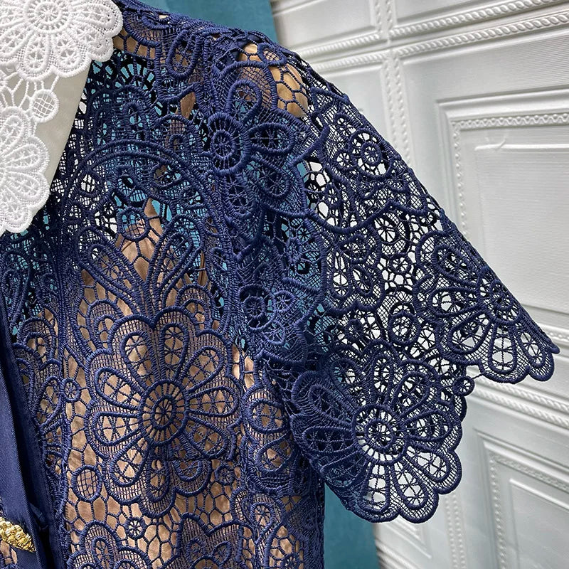 Water soluble lace Navy Blue peter pan collar pocket buttons decoration women dress high waist slim temperament Pencil Dress