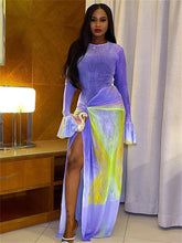 Weird Puss Contrast Patchwork Mesh Dress Women o-Neck Flared Sleeve Ruched Kink High Splits Hem Midnight Sexy Fashion Long Dress
