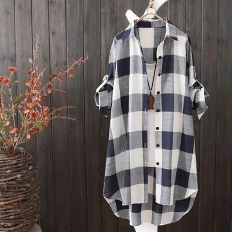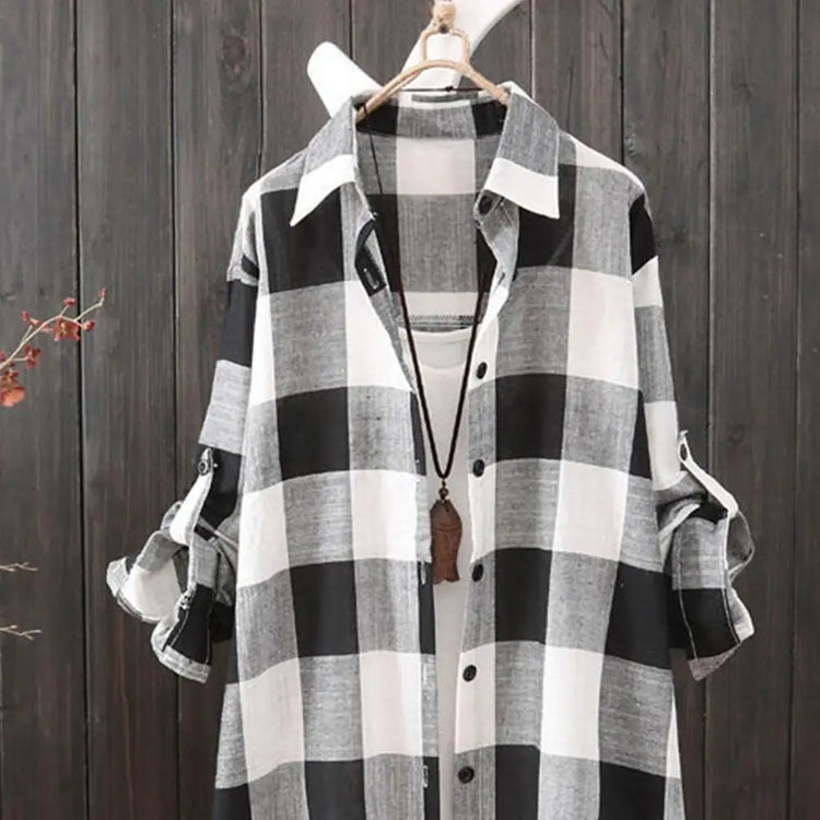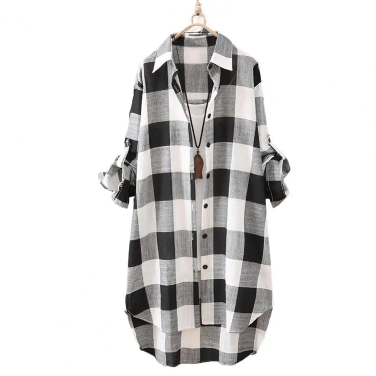 Women's shirts with long sleeves, pull-up sleeves, lapels, mid-length, check print, simple appearance are very popular among women.