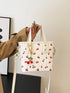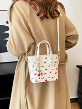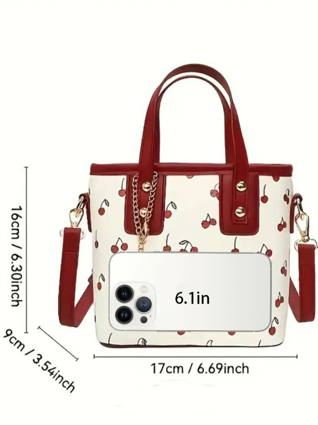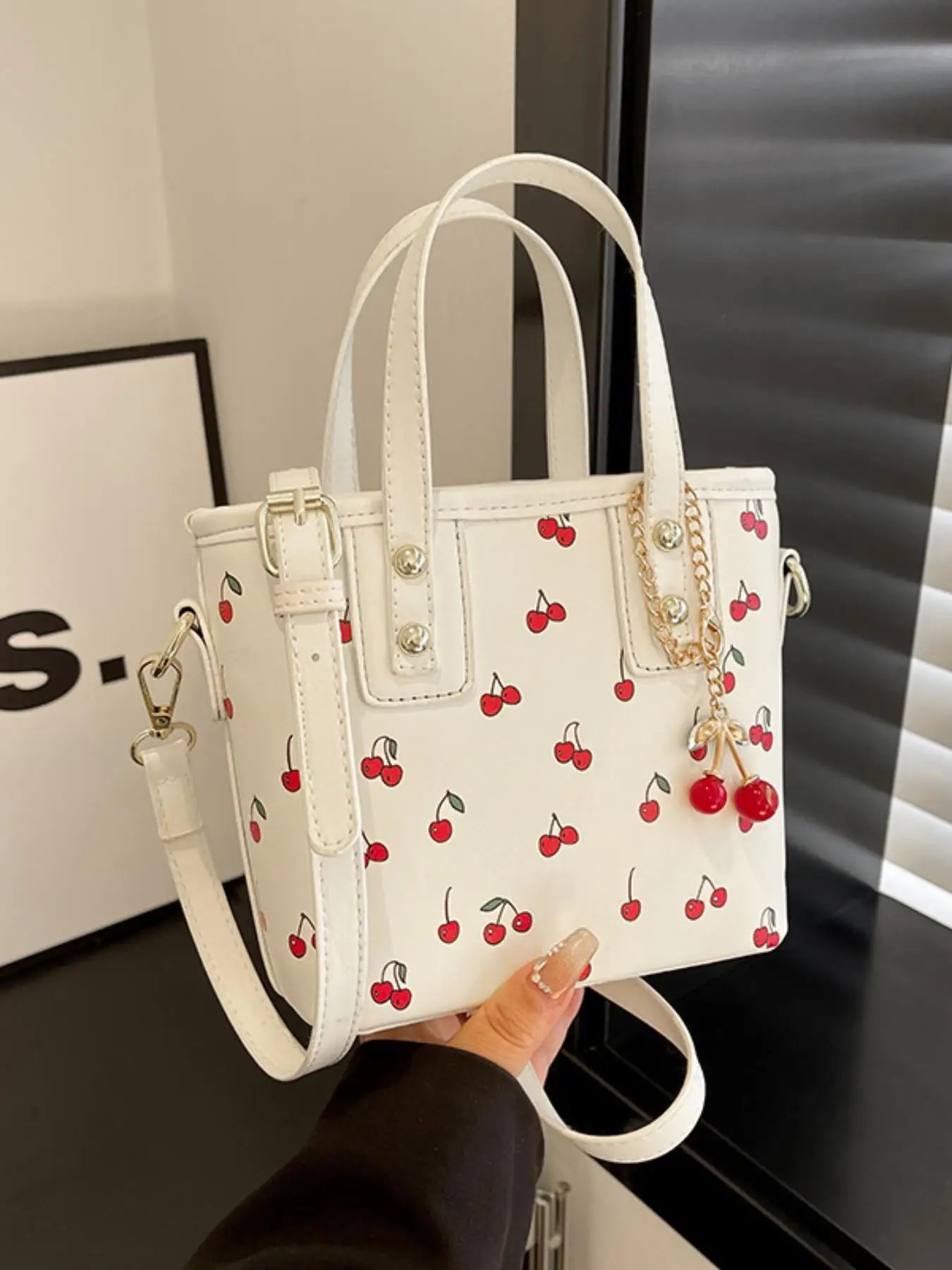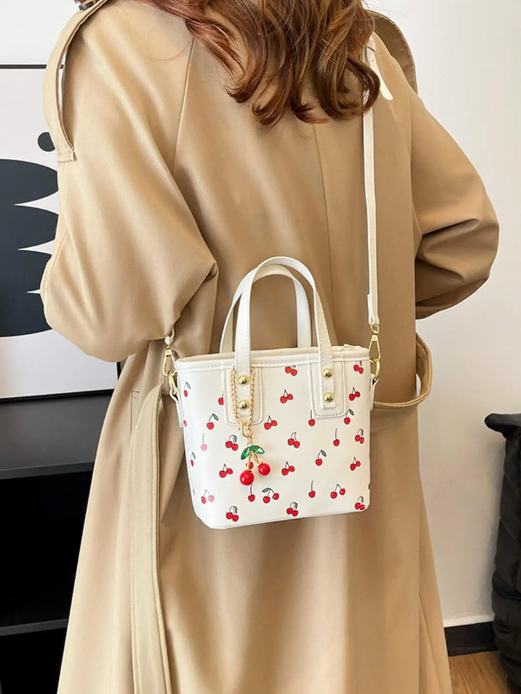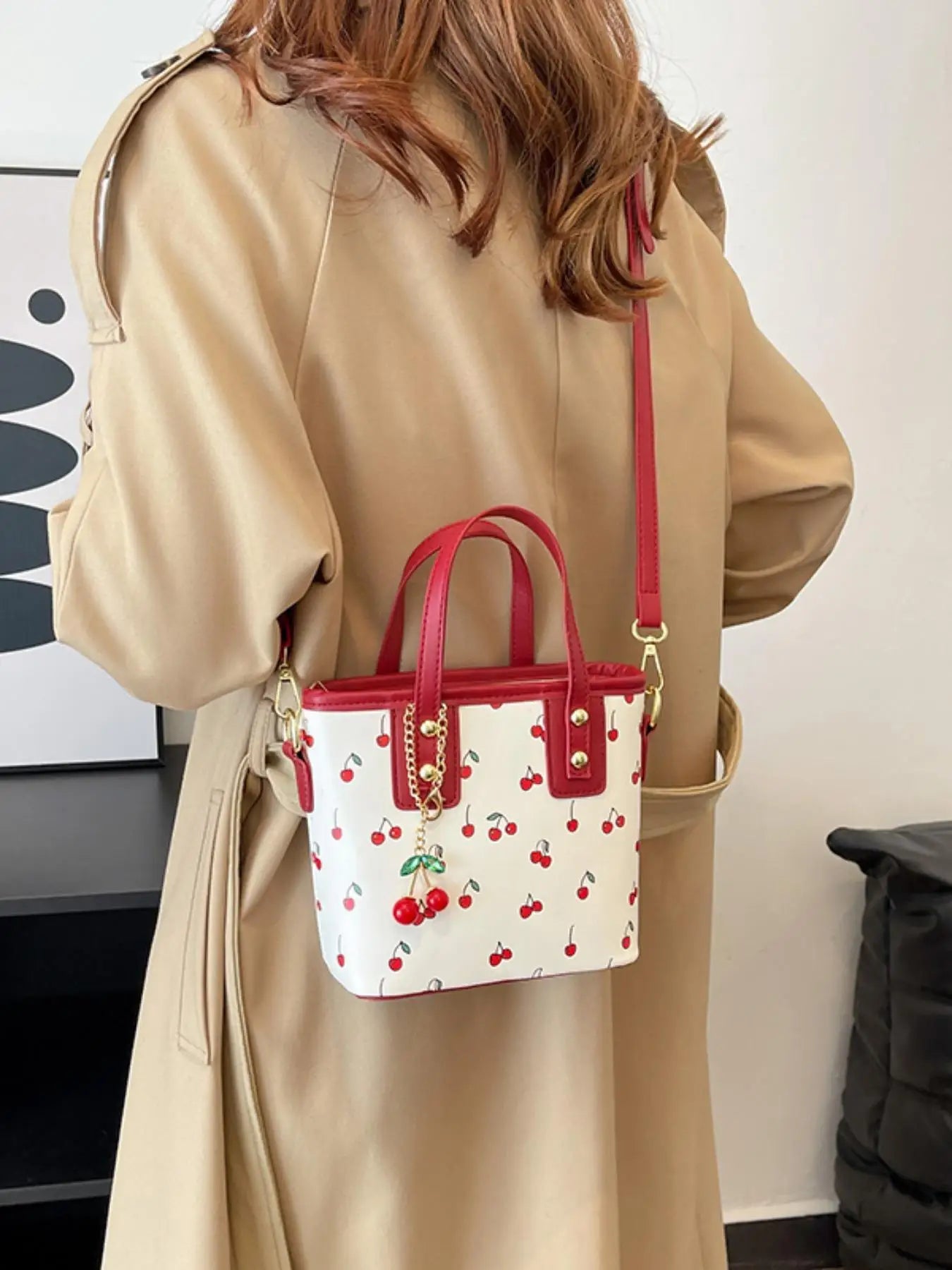 Women's Bucket Bag with Cherry Pattern, DetachableCherry Charm, and Zipper Closure - Stylish RedAccent Shoulder & Crossbody Bag