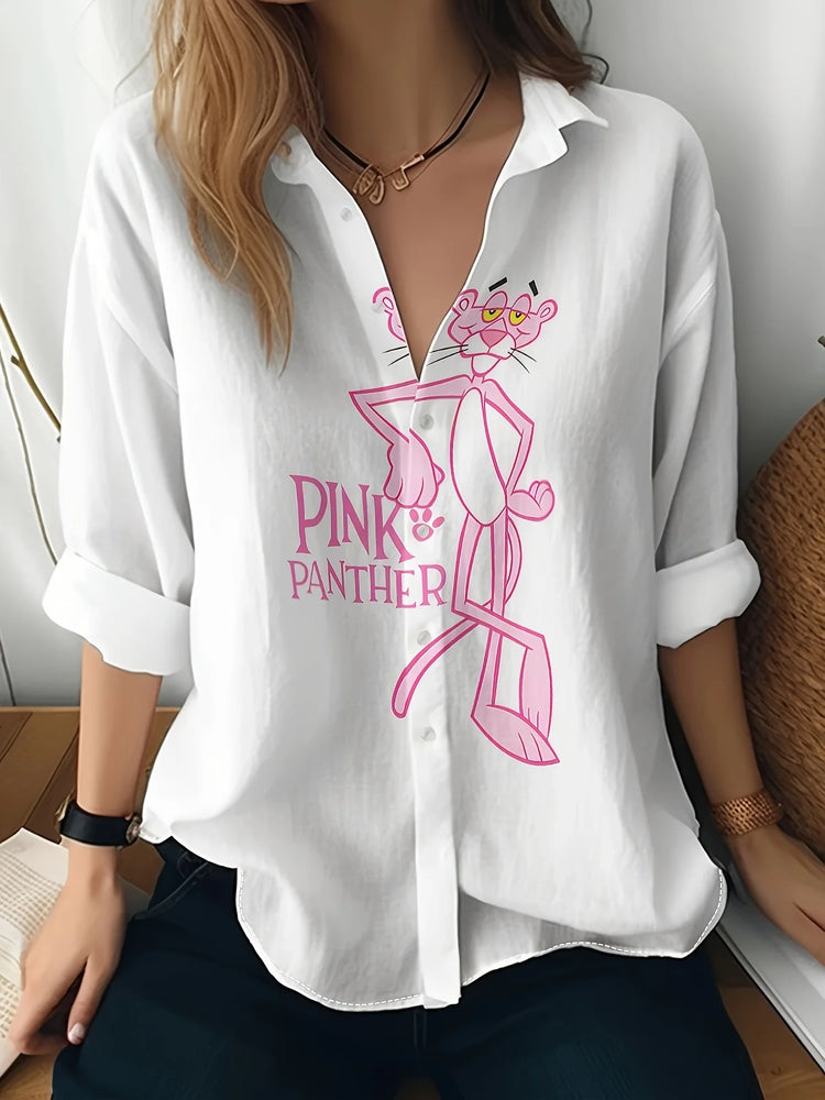 Women's Long Sleeve Shirt Cute Pink Leopard Cartoon Print Casual Button Lapel Casual Tops