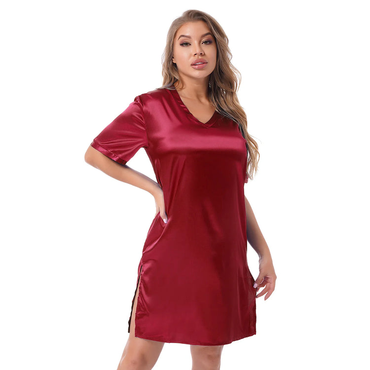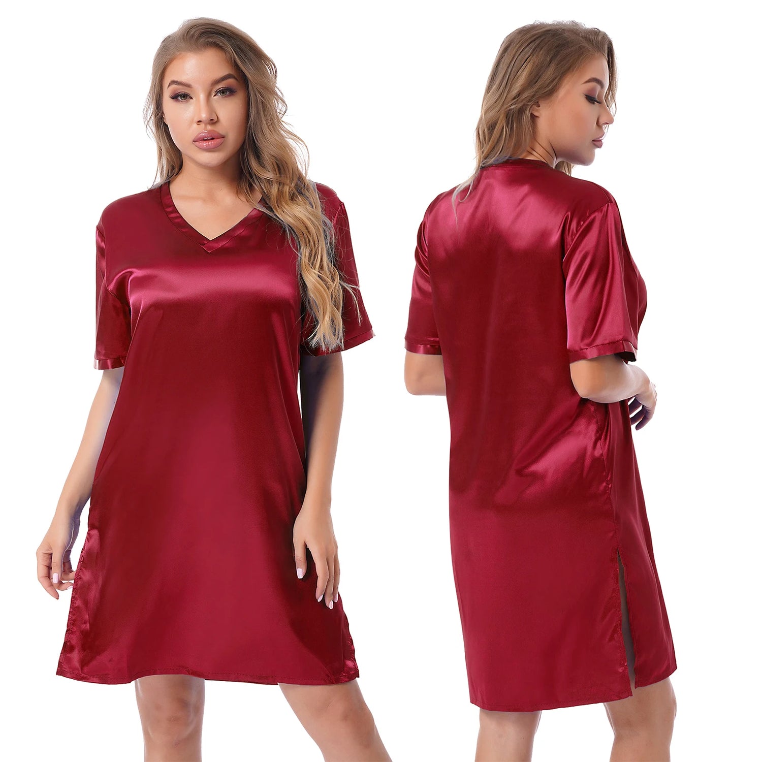 Womens V Neck Satin Nightgown Short Sleeve Nightdress Loungewear Sides Split Nightwear.